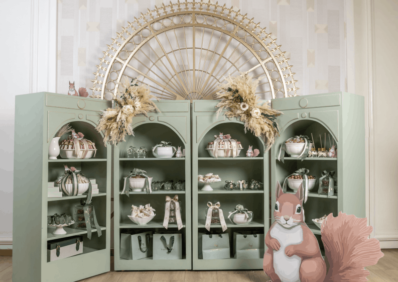 Plongez dans l’univers doux et poétique de notre buffet de naissance imaginé autour d’un vert sauge apaisant, d’éléments en porcelaine raffinée et d’un adorable écureuil, messager de tendresse et de gourmandise. Chaque détail a été soigneusement pensé pour créer une atmosphère à la fois élégante, naturelle et chaleureuse, célébrant l’arrivée d’un nouveau-né avec délicatesse.
