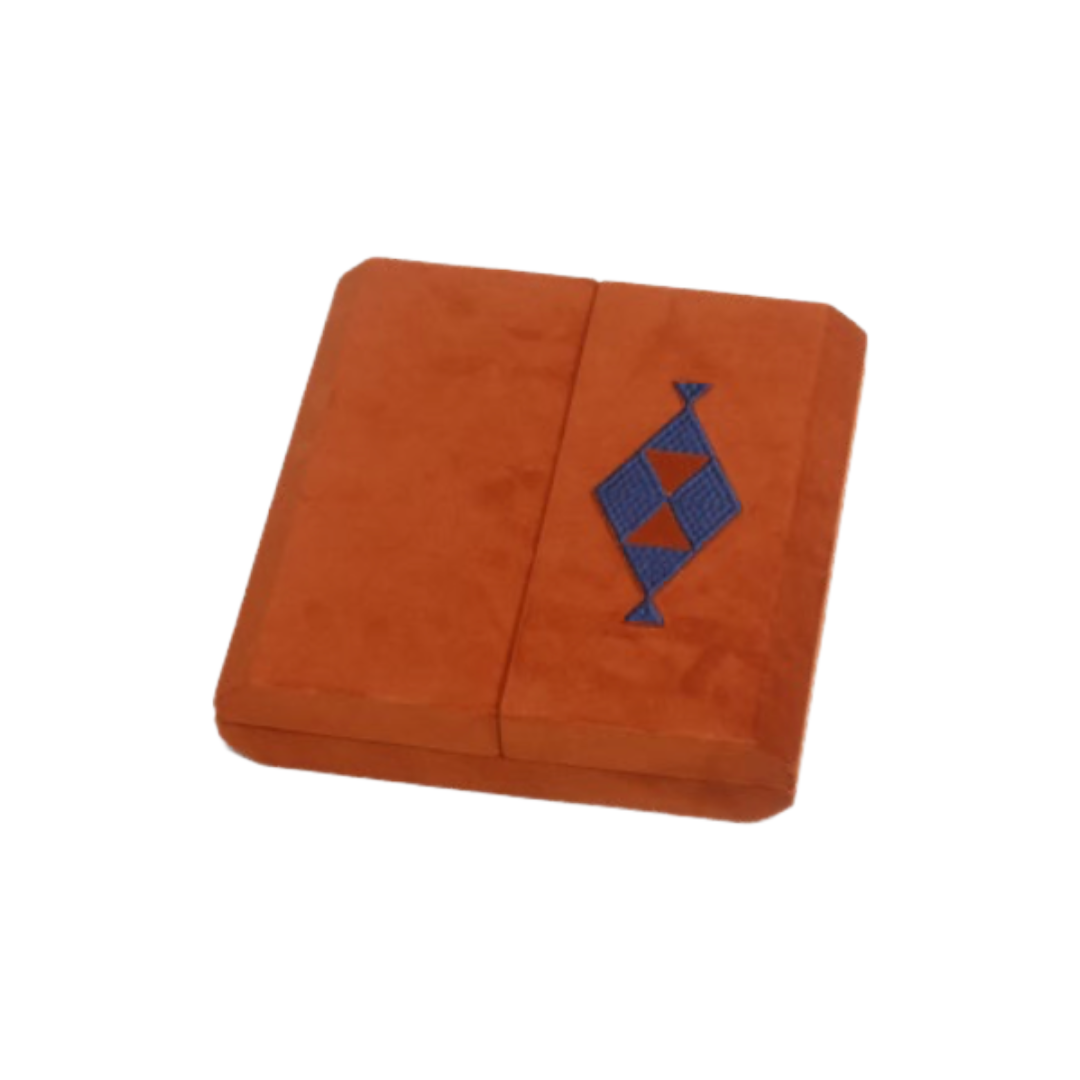 Coffrets carrés à coins arrondis en velours teinte terracotta et bleu, ornés d’une broderie