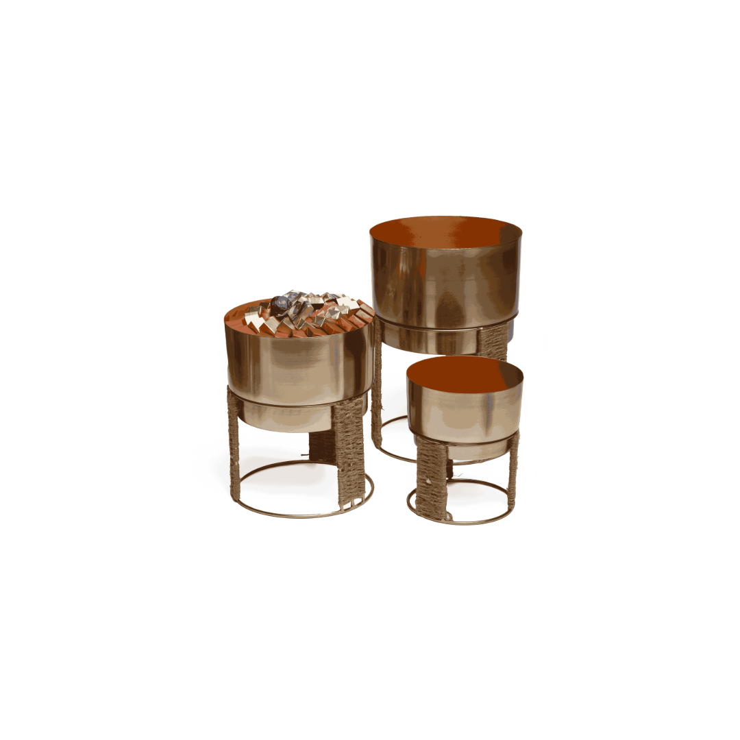 Coupe sur pied metal doré mate avec base tressée pour une touche artisanale.