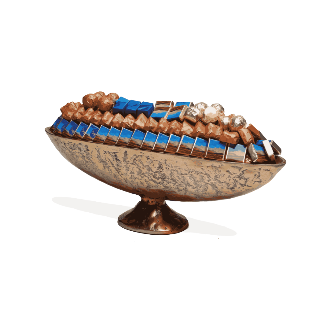 Élégante coupe ovale sur pied en métal couleur vieil or martelé inspirée des formes sahraoui.